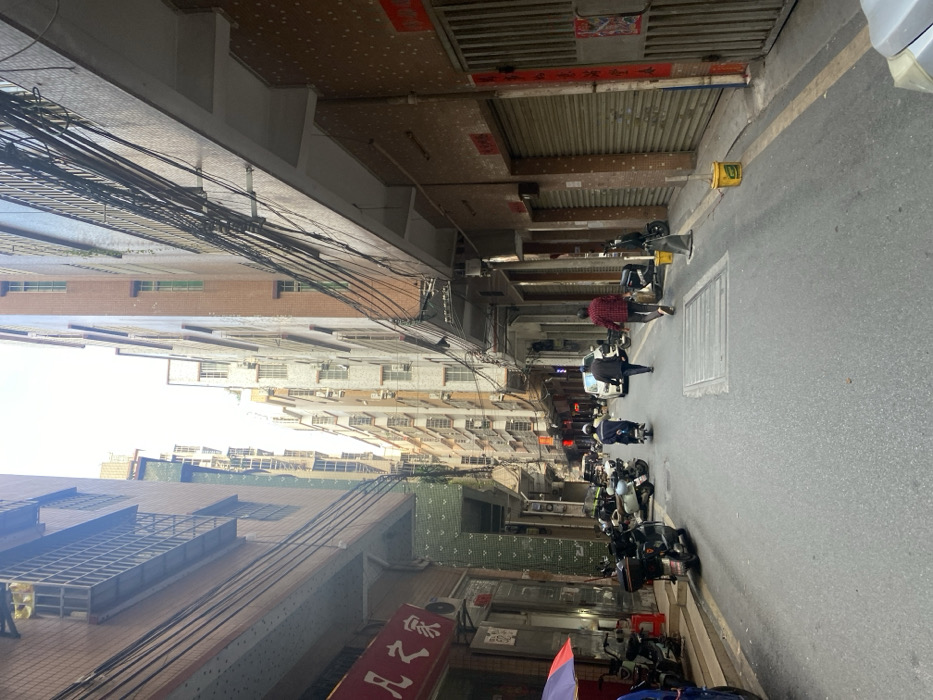 The image depicts a narrow urban street in Baiyun District, China, viewed from a low angle