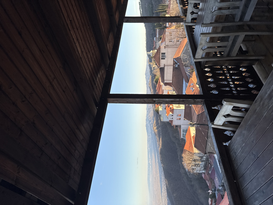 The image displays an outdoor dining or viewing terrace located in Sighnaghi, Georgia, providing an elevated perspective of the city and its surrounding environment. The immediate foreground features a dark-stained wooden slatted ceiling structure supported by thick wooden posts. The terrace floor is also composed of dark wood. Multiple empty wooden tables, rectangular in shape, are present, each accompanied by matching wooden chairs with carved backrests. A dark-stained wooden railing, featuring a repeating pattern of decorative cut-outs, encloses the terrace. Beyond the railing, the midground presents a dense arrangement of buildings characteristic of Sighnaghi, primarily featuring light-colored facades and numerous terracotta-tiled roofs. These structures are built along a steep hillside. Deciduous trees, currently bare, are visible among the buildings. In the upper-right midground, a prominent light-colored building with a dome and spire stands out. The background reveals a vast valley stretching towards the horizon, bordered by multiple layers of undulating hills and mountains under a clear, bright blue sky. Sunlight illuminates portions of the town's rooftops and the distant landscape. No individuals are present, and no actions or interactions are depicted.