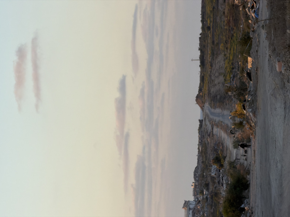 The image depicts a rural landscape in Az-Zahra, Palestinian Territory, under a pale, diffused sky with scattered, elongated clouds. A dirt road, appearing worn and unpaved, curves from the lower-left foreground into the midground, ascending towards the upper right. An adult figure dressed in dark clothing walks along this road in the midground, moving from left to right, accompanied by two smaller figures and a dog or similar animal directly behind them. The immediate foreground consists of uneven, light-colored dirt and scattered debris. The areas surrounding the road are characterized by sparse, scrubby vegetation, dry earth, and extensive accumulations of rubble and discarded materials, including remnants of demolished structures, particularly prominent on the left side. In the far-left midground, a partially collapsed or destroyed building with a distinct archway-like opening is visible. To the right of the road, a mound of earth or debris rises, and further beyond it, a utility pole stands. The distant horizon is indistinct, possibly hinting at a body of water or flat terrain. The overall lighting suggests either dawn or dusk, casting soft, low-angle illumination across the scene.