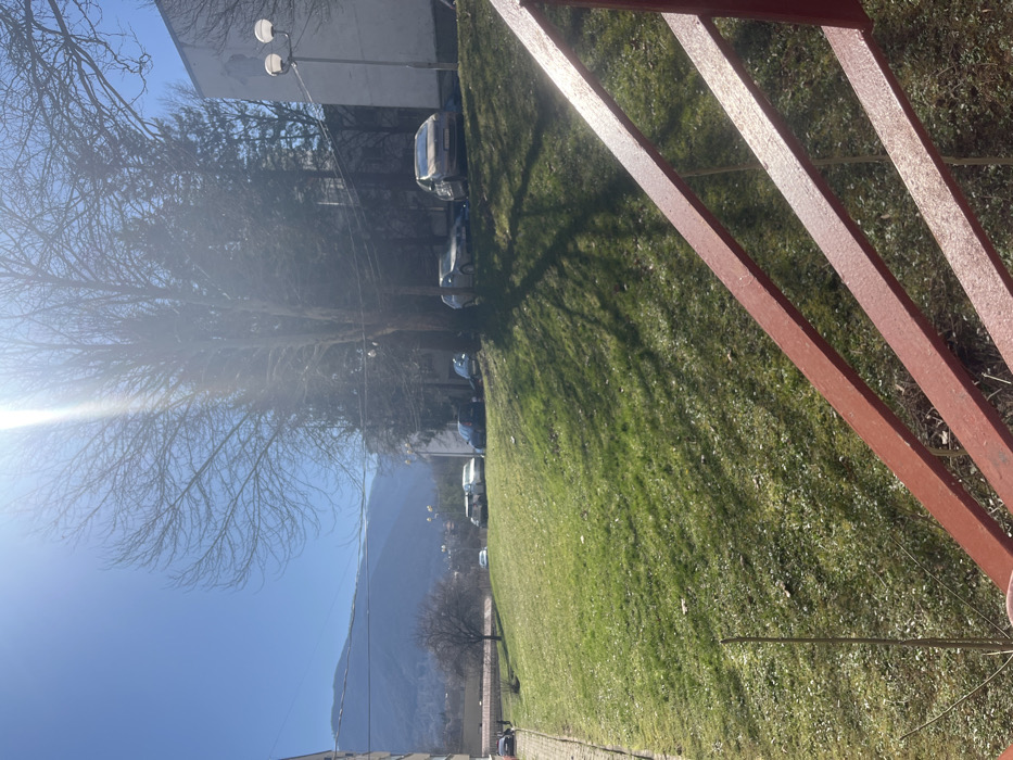 The image captures an outdoor daytime scene in Pravets, Bulgaria, on a clear, sunny day. The perspective is from an elevated position, looking down across a grassy slope towards a street, parked vehicles, buildings, and distant mountains. In the immediate foreground, to the bottom right, three parallel, reddish-brown painted metal or wooden bars, likely part of a railing or fence, extend diagonally upwards and to the left. A slender, light-colored vertical element with radiating spokes is partially visible at the bottom left. The midground features a gently sloping green lawn, well-lit by direct sunlight, with distinct tree shadows stretching across it from the right. Along the upper edge of this slope, multiple cars are parked on what appears to be an unpaved or informal parking area. Vehicles visible include a light-colored sedan on the far left, a dark hatchback, a white SUV, another dark vehicle, a silver-colored BMW sedan, and a beige or gold-colored sedan with a partially visible rear license plate. The background consists of several tall, deciduous trees with bare branches, concentrated on the right side, extending towards the top of the frame. To the right of these trees, a light-colored, multi-story building with a slightly weathered facade is visible. A white street lamp featuring two spherical lights is mounted on its exterior. Utility lines are stretched horizontally across the upper mid-section of the scene. In the far background, a prominent range of mountains, partially forested, rises under a bright blue sky. A few smaller residential structures are discernible further down in the valley, in front of the mountains. No individuals are visible in the scene, and no specific actions or interactions are occurring. The environment suggests an urban or suburban area situated within a mountainous landscape.