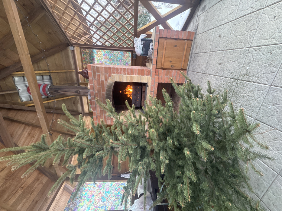 The image depicts the interior of a wooden, open-sided gazebo or pavilion. A large, undecorated evergreen tree, consistent with a fir or spruce, stands prominently on the left side of the frame. In the center-right, a built-in red brick fireplace-style structure contains an active fire with visible flames and embers on a metal grate. A dark brown, ridged pottery object rests on top of the brick structure. To the immediate right of the firebox, an extension of the brickwork forms a counter, with a wooden cabinet door situated below it. A black plastic crate containing items, including a white plastic bag, is positioned on this counter. The ceiling of the structure is constructed from wooden beams and planks, with a metal chimney pipe and string lights visible overhead. The floor consists of light-grey, textured square tiles. Behind the evergreen tree on the left, a dark surface resembling a bench or table is partially visible, alongside a brightly colored, patterned panel. Through the open wooden lattice on the right side of the gazebo, snow-covered ground and bare trees are discernible, indicating an outdoor winter environment. No individuals are present in the scene. The specific location within Капцёўскі сельскі Савет, Belarus, is not visually verifiable from the provided image data.