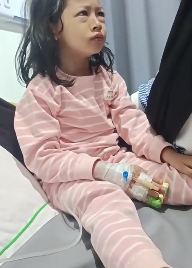 A young girl sits in a hospital bed, wearing a pink and white striped pajama set. An IV line is attached to her hand. She looks to her left with a slightly pouting expression. A woman wearing a black hijab stands beside her, partially visible. The bed has grey and white bedding with a green stripe on the edge. The room appears to be a hospital room, with light colored curtains in the background. The girl makes a crying sound.