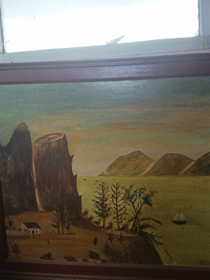 A framed landscape painting is centrally depicted, positioned beneath a white-framed window, in the city of Dogsenang Gorphoog, Bhutan. The painting, an oil on canvas, features a sky transitioning from light blue-green at the top to a muted orange-yellow horizon line. Below the horizon, a large body of olive-green water occupies the central and right portions of the image, bordered by multiple rounded, green-brown hills or mountains in the distance. Two small, dark boat-like forms are visible on the water in the mid-distance, and a larger sailboat with a dark hull and white sails is positioned in the lower-right quadrant of the water. The foreground comprises a brown-toned landmass. On the left, two prominent, dark brown rock formations or cliffs rise; the leftmost is slender and conical, while the central one is wider with a relatively flat top and irregular, jagged sides. A small, white house with a dark roof and a single dark window is situated in the lower-left, partially behind the rock formations, with a faint white fence in front. Two small, dark, indistinct human figures are present on the land; one has a small reddish detail and is near the house, while another dark figure is situated further right. Scattered trees, including slender dark-branched forms with sparse green foliage and a denser cluster on a promontory extending into the water, are visible. Several dark, irregular rocks are on the ground in the lower-center. A faint dark signature or inscription is located in the painting's bottom right corner. Above the painting, a bright, diffused light source is visible through a white-framed window, which exhibits minor weathering. A small, light-colored piece of debris or paper is affixed to the upper right portion of the window frame.