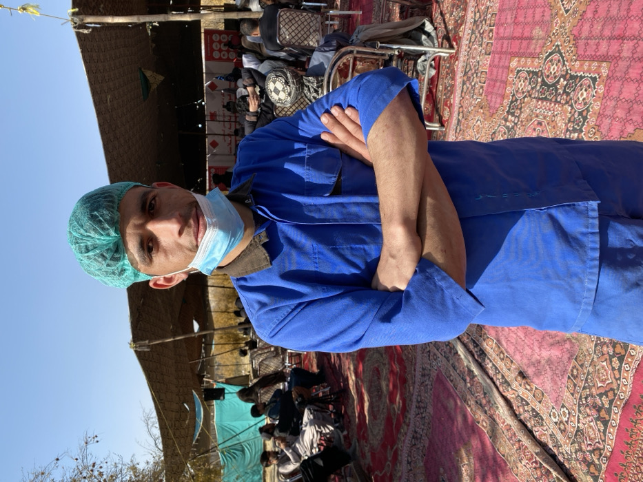 This image depicts an outdoor gathering in Sard-E 'olya, Afghanistan, under clear blue skies with bright sunlight. The foreground is dominated by a young adult male, positioned slightly left of center, looking directly at the camera with a neutral expression. He wears a teal-green disposable hairnet and a light blue surgical mask pulled down below his chin. His attire consists of a blue work shirt with a dark brown collar and a left chest pocket, and matching blue trousers. His arms are crossed over his chest. The ground is covered with multiple red and black patterned rugs or carpets. In the mid-ground and background, numerous individuals, primarily males, are seated on chairs or on the ground, attending an event. They are dressed in various casual and traditional garments. A large, makeshift canopy constructed from camouflage netting or similar fabric, supported by poles, provides shade over the gathering. A lighter-colored tarp is visible further left. Bare tree branches are present on the far left. A banner or display board with red and white text and graphics is visible under the main canopy.
