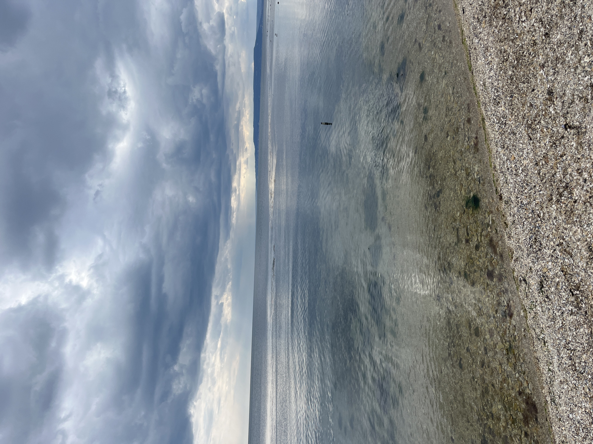 view of the sea at Balchik, Bulgaria, taken from the shore. The sky is filled with gray clouds, with some lighter patches. The sea is calm, with gentle ripples on the surface. In the distance, the coastline of the opposite shore is barely visible. Closer to the shore, the water is clear enough to reveal the seabed. The shoreline itself is composed of small shells and pebbles. There is a single, dark object visible in the water, some distance from the shore. The image is oriented vertically.