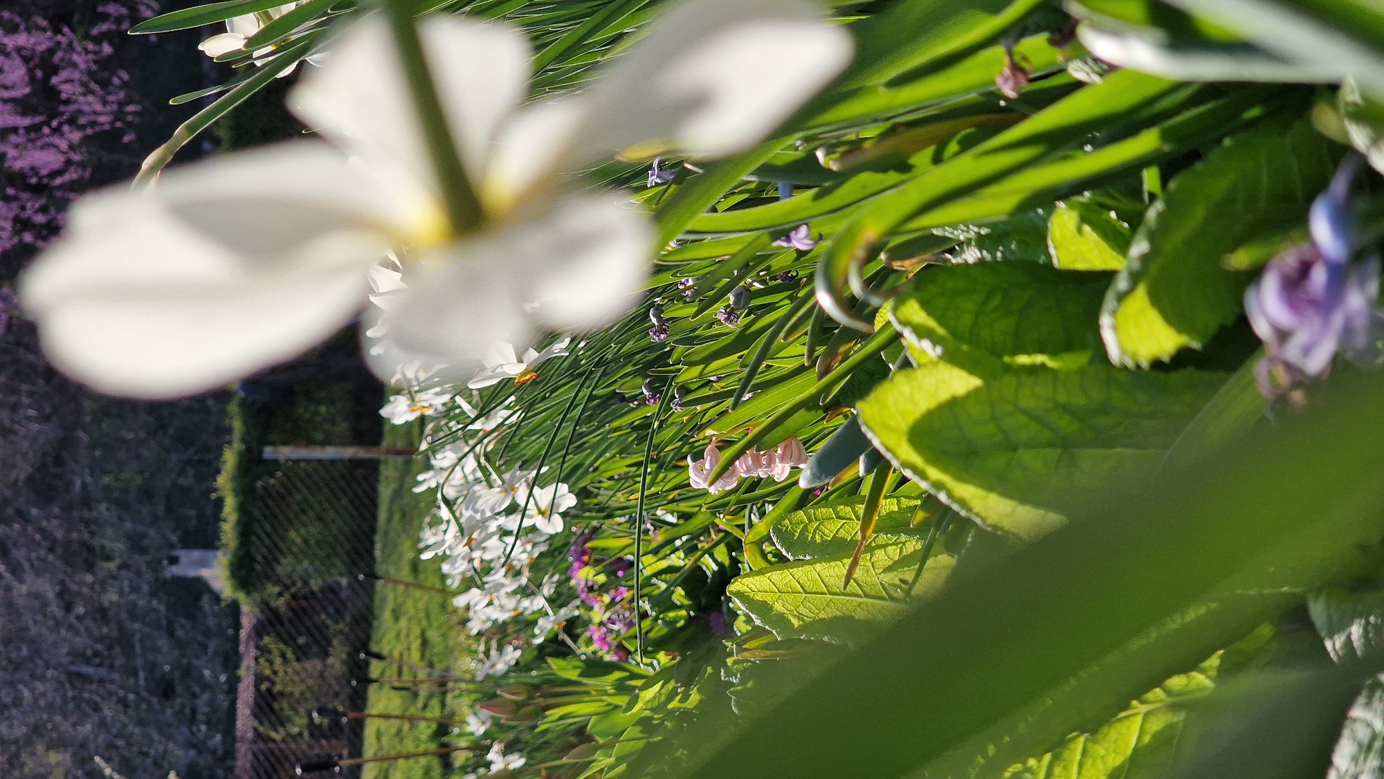 close-up view of a garden in Apriltsi, Bulgaria, featuring a variety of plants. White daffodils are prominent in the background and middle ground, along with purple and pink flowers. Green foliage dominates the image, with some leaves brightly lit by sunlight. A blurred white flower appears in the foreground. A fence and some distant greenery are visible in the background, suggesting the edge of the garden. The image is rotated.