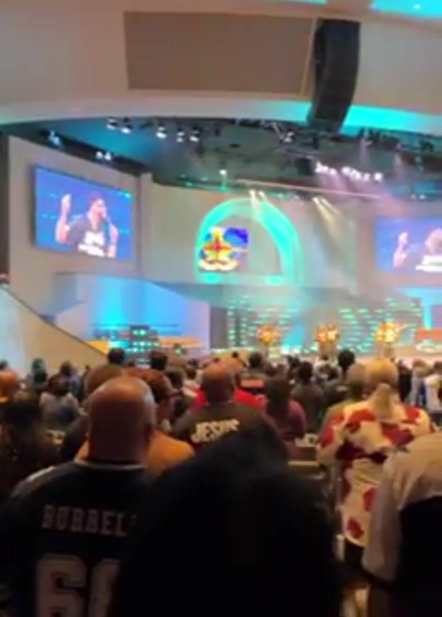 church service with a preacher on stage. A band is playing behind him, and the audience is watching and listening. There are two large screens on either side of the stage showing the preacher. The church is brightly lit with colored lights. People in the audience are wearing casual clothes and sports jerseys. Smoke fills the room at one point.
