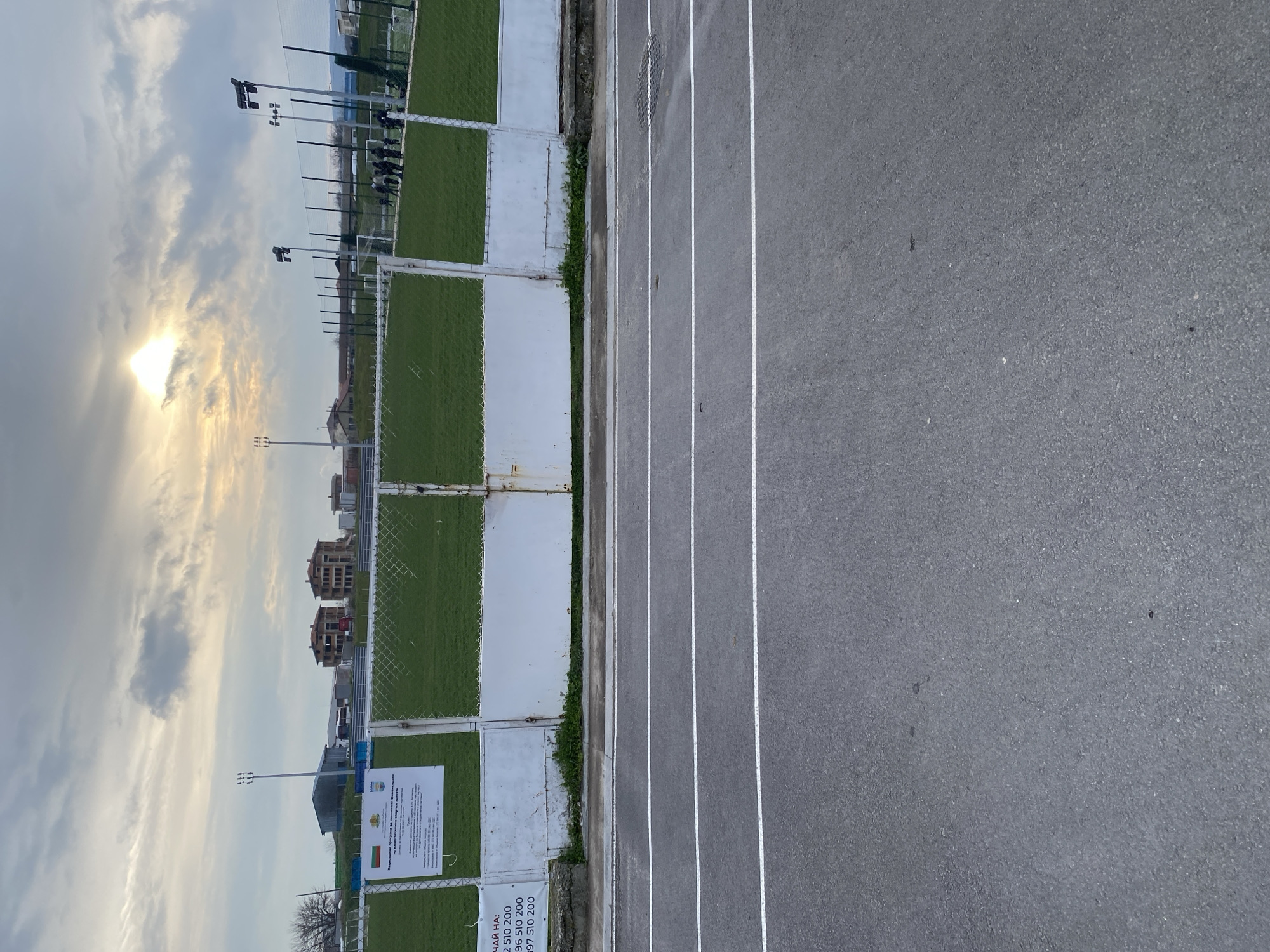 The image depicts a view of a sports complex in Aksakovo, Bulgaria. The scene includes an artificial turf sports field enclosed by a fence with white panels, adjacent to an asphalt running track with white lane markings. The sky is overcast with the sun obscured by clouds. Buildings are visible in the background behind the sports field. A sign is attached to the fence. The photo is oriented with the field and fence on the left and the track on the right.