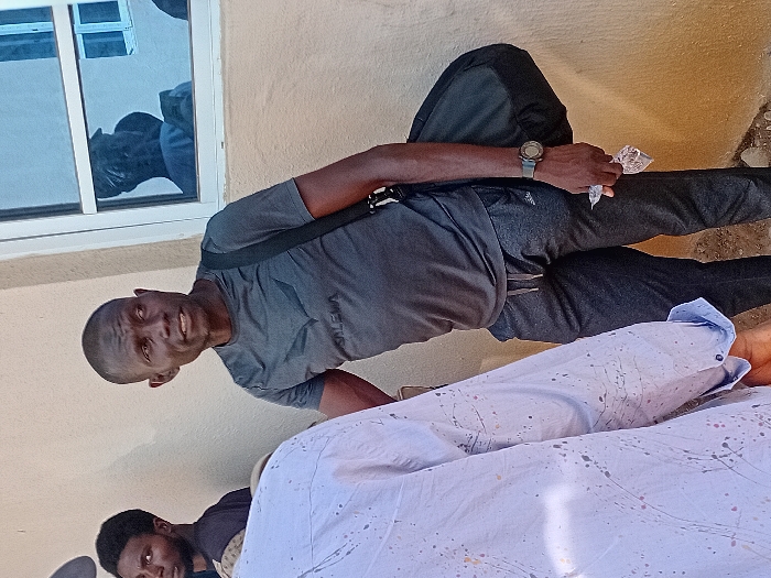 An adult male, wearing a grey t-shirt, dark pants, and a wristwatch, is photographed outdoors with two other individuals. He has a shoulder bag and is holding a small transparent plastic bag. The scene is set outside a building featuring a window with a reflection. Another person, partially visible, is wearing a dark shirt and has a beard. The third person has a light-colored shirt.