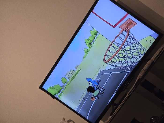 The scene captures a black-framed SONY television screen displaying an animated program, photographed in a domestic setting within Oslo, Norway. The television is angled approximately 15 degrees clockwise from vertical. On screen, two animated characters are depicted on a dark grey basketball court with white boundary lines. The character on the left, a green raccoon-like figure, holds an orange basketball. To their right and slightly behind, a blue jay-like character stands. A basketball hoop with an orange rim and a white net is prominent on the right side of the screen, attached to a white backboard with a red outline. Beyond the court, a light green grassy field with trees and distant buildings extends under a light blue sky. The wall surrounding the television is a plain, light beige color. Indistinct dark objects are visible beneath the television.
