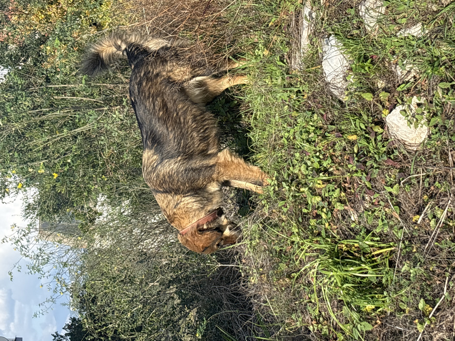 - "This image captures a large, shaggy-haired dog with tan, brown, and black brindle fur, wearing a red collar, engaged in sniffing the ground" by FM-CAOHw1, licensed under CC BY 4.0
