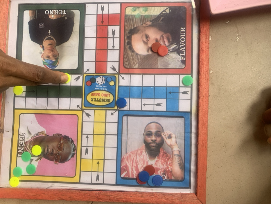 An overhead shot depicts a customized Ludo board game, stated to be located in Aba, Nigeria