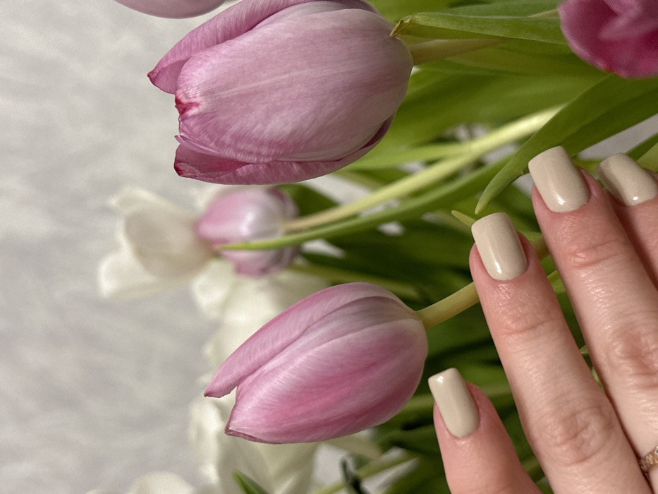 The image displays a close-up scene located in Nekrasovskiy, Russia, featuring a human hand positioned amidst a bouquet of tulips. A person's left hand, showing four fingers and part of the thumb, is visible in the lower-left quadrant. The fingernails are uniformly short, square-shaped, and coated with a light beige or nude-colored opaque polish. A gold-toned ring with small, possibly diamond-like stones is worn on the ring finger. The hand is gently interacting with the green stem of a light pink tulip situated on the left side of the frame. Two prominent pink tulips, still closed in bud form, dominate the foreground. The tulip on the right exhibits a slight reddish discoloration or bruising along the rim of its uppermost petals. A cluster of other tulips, both pink and white, are visible in the blurred background, their green stems and leaves forming a dense mass beneath the flower heads. The background above the flowers is indistinct, appearing as a light, textured surface.