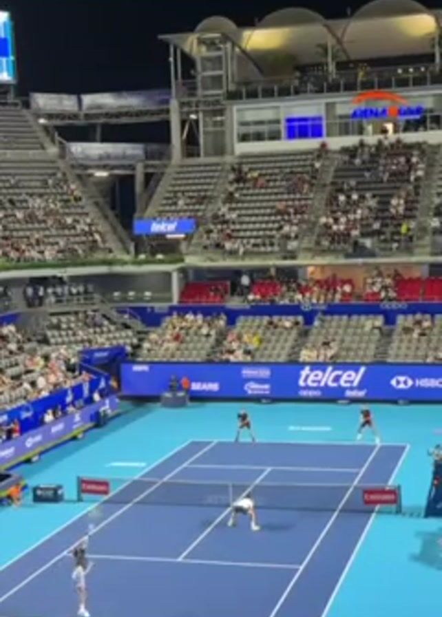 - "tennis match in progress on a blue outdoor court at night, with a large crowd watching from the stands" by FM-4tJwl2, licensed under CC BY 4.0