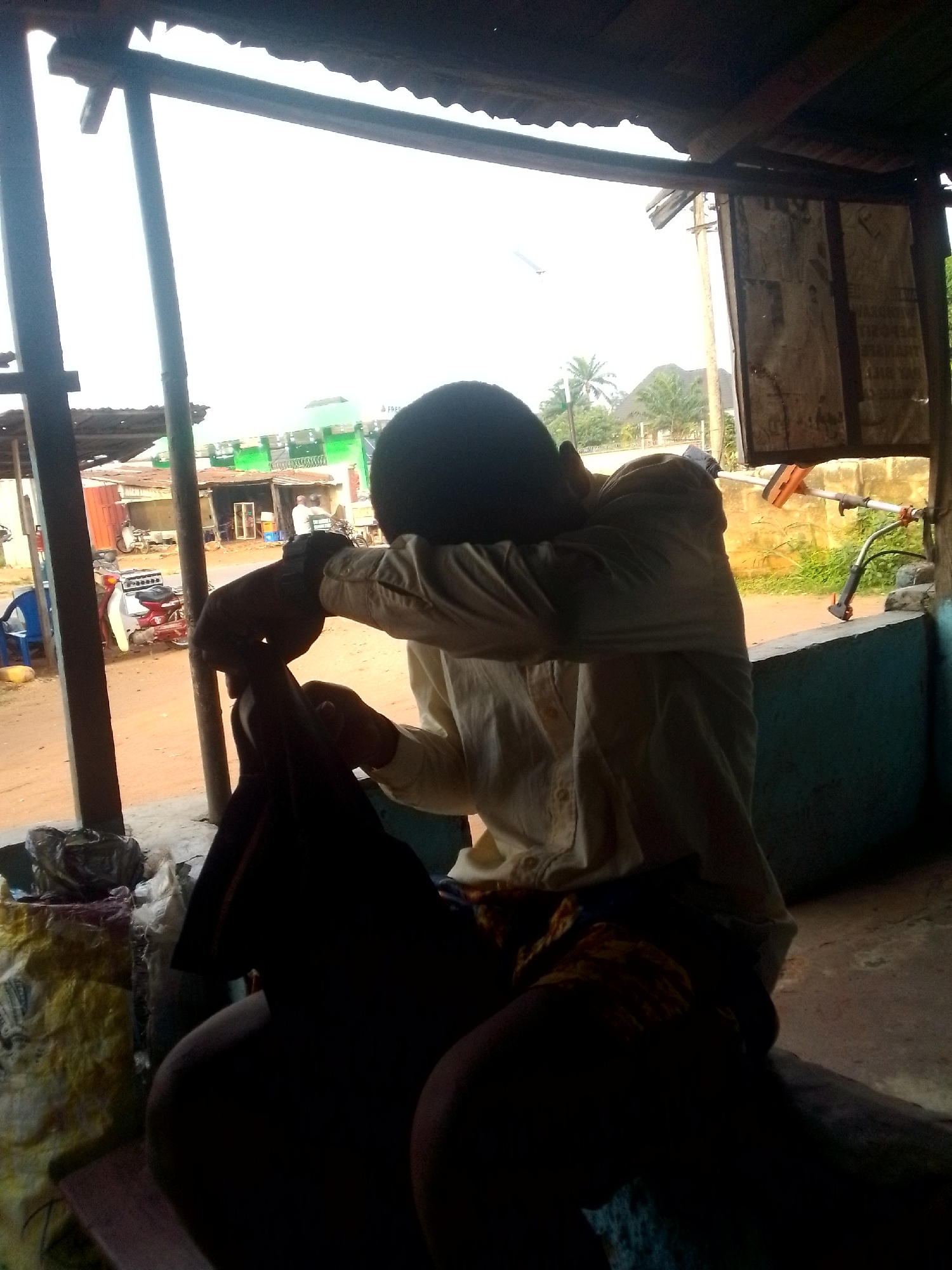 A person with their head covered by their arms and a dark object in their lap is sitting inside a shelter. The person is wearing a light-colored, long-sleeved shirt and patterned fabric at their waist. Outside the shelter, there is a view of a street with buildings, vehicles, and vegetation.