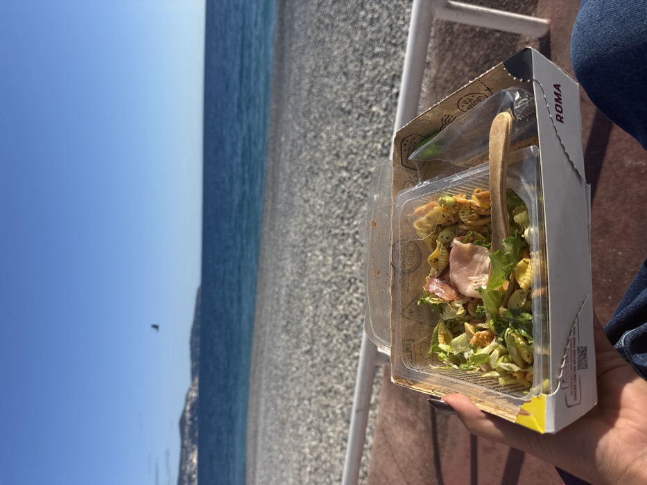 The image captures a first-person perspective of a person holding a takeaway meal at the Promenade des Anglais in Nice, France