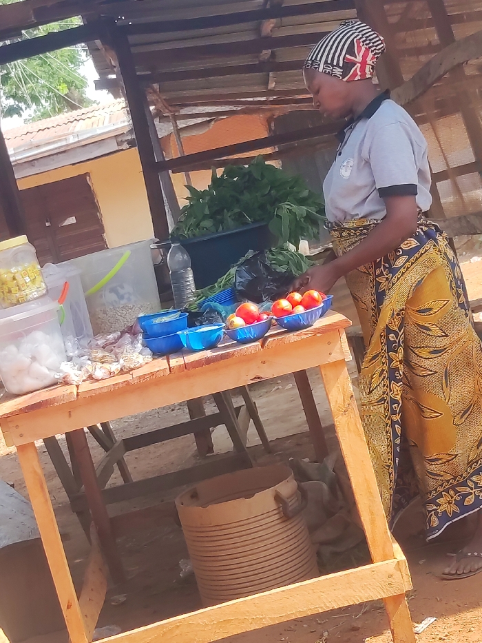 An outdoor market stall in Akwanga, Nigeria, features a single adult female attending to merchandise under a rudimentary wooden shelter with a corrugated metal roof