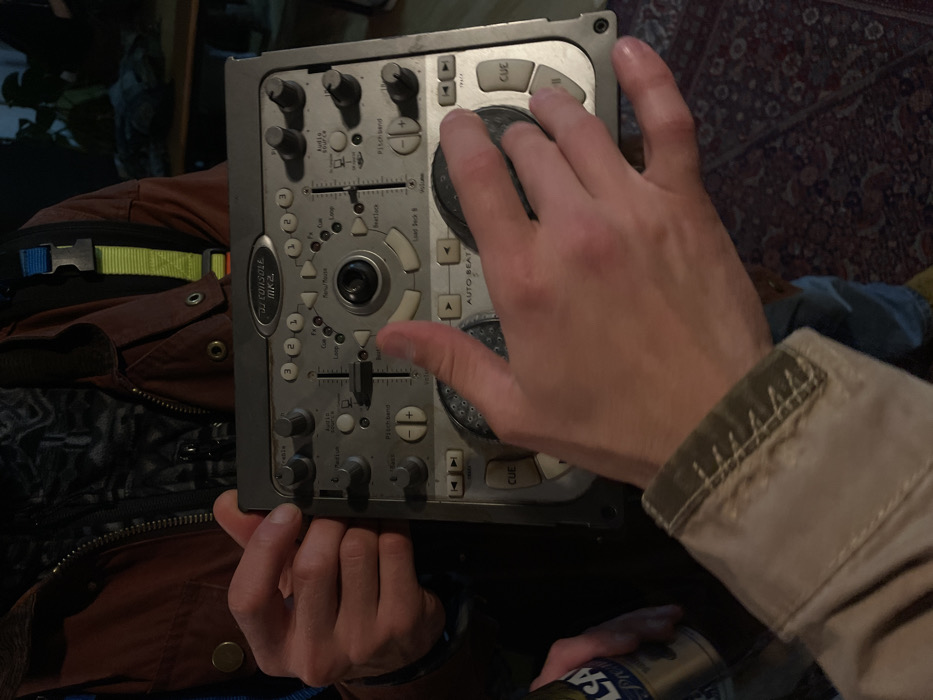 A DJ console, specifically a DJ Console MK2, is the focal point. A person's hand is poised over the right jog wheel, near the "Cue" and "Pause/Play" buttons. The panel is silver and shows various knobs, buttons, and a crossfader. A red-brown jacket with visible zippers and buckles is visible behind the DJ console. The person holding the device also holds a beer can in their other hand, wearing a light-colored jacket.