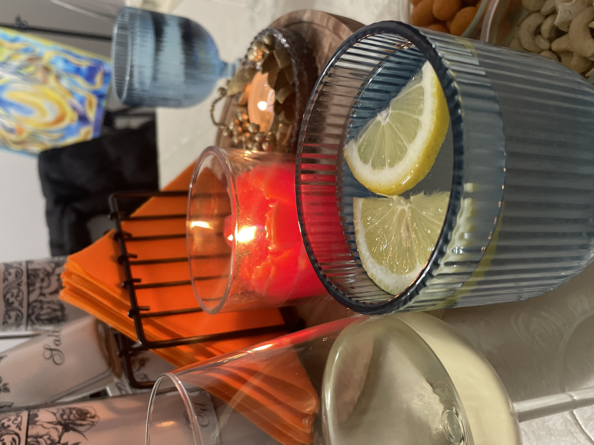 The image depicts a close-up of a table setting, indoors, with several objects arranged in a casual manner. A blue, ridged glass filled with two lemon slices dominates the right side of the image. Adjacent to it, a clear glass candle holder contains a red candle, which is lit. Underneath and around these items, there are various objects, including a stack of orange napkins held in a black wire rack, other clear glasses or containers, and some wooden surfaces. In the background, there are more glasses and bowls, and what appears to be a container of nuts. The scene suggests a table prepared for a gathering or celebration. The location of Smolyan, Bulgaria is not evident from the given image.