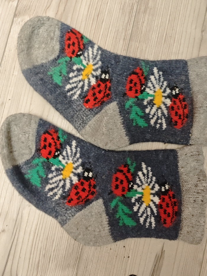 The scene is located in Свистуха (кузяевский С/о), Russia. A pair of knit socks is displayed on a light-colored wooden floor. Both socks are primarily dark blue, featuring grey toes, heels, and cuffs. The dark blue sections are patterned with repeated motifs of red ladybugs, each with black spots and a black head, alongside white daisies with yellow centers and small green leaf clusters. The socks are oriented diagonally across the frame, with the upper sock positioned slightly above and to the left of the lower sock. The wooden floor exhibits vertical planks with visible grain. No individuals or active subjects are present.