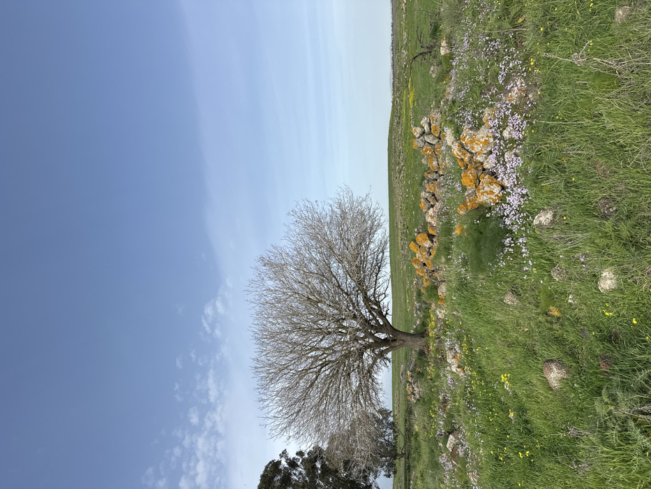 The image presents a rural landscape located within the Golan Regional Council, Israel, under a partly cloudy sky. A large, leafless deciduous tree with a wide, intricate branch structure and a dark trunk stands prominently in the mid-ground, slightly left of center. To its immediate left and partially obscured, another bare deciduous tree is visible, with a tall, dark evergreen tree on the far left edge of the frame. In the mid-ground, in front of the central tree, a low, linear formation of weathered stones spans horizontally. Many of these stones are covered with distinct patches of bright orange and yellow lichen. The ground in the foreground and mid-ground is covered in vibrant green grass, interspersed with numerous small purple/light pink wildflowers, particularly dense in the lower right, and scattered yellow wildflowers. Individual grey stones are distributed throughout the foreground grass. The background consists of gently rolling green hills extending to a hazy horizon line beneath the light blue sky, which features scattered wispy white clouds, denser towards the left. No people, actions, or interactions are visible.
