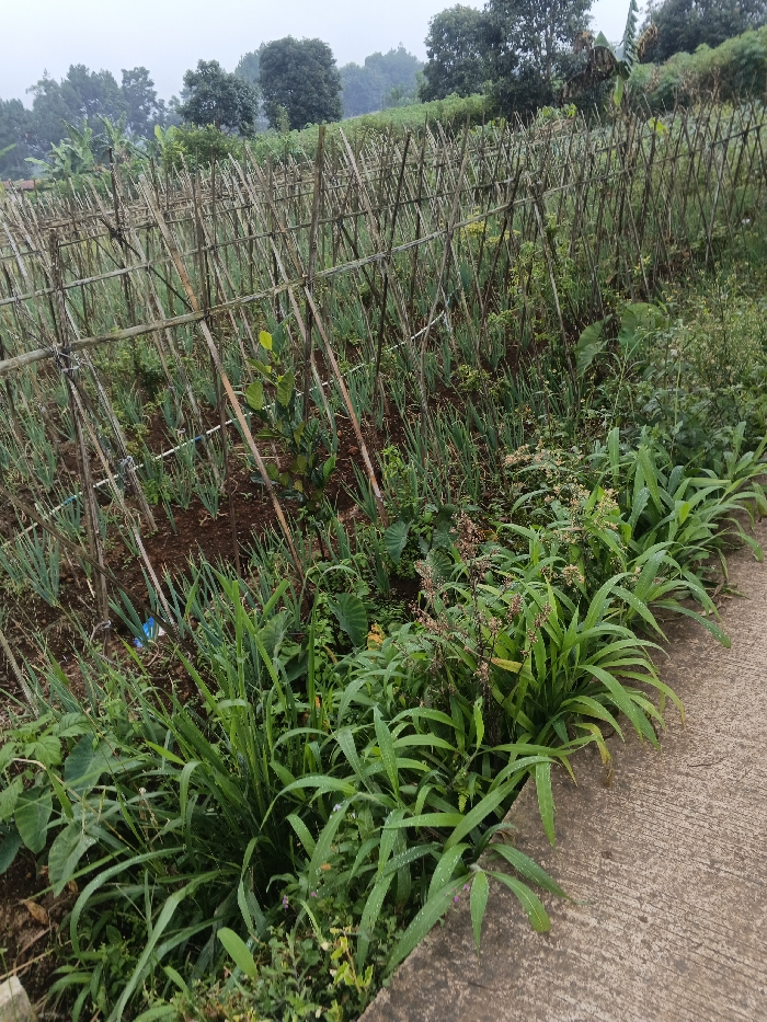 A rural agricultural scene showcases a field of cultivated scallions supported by a bamboo frame structure. Lush green foliage, including grasses and leafy plants, borders a concrete path, creating a natural edge. Beyond the field, a backdrop of trees and a misty sky suggest a high-altitude or mountainous location. The overall impression is one of a small-scale, traditional farming practice.