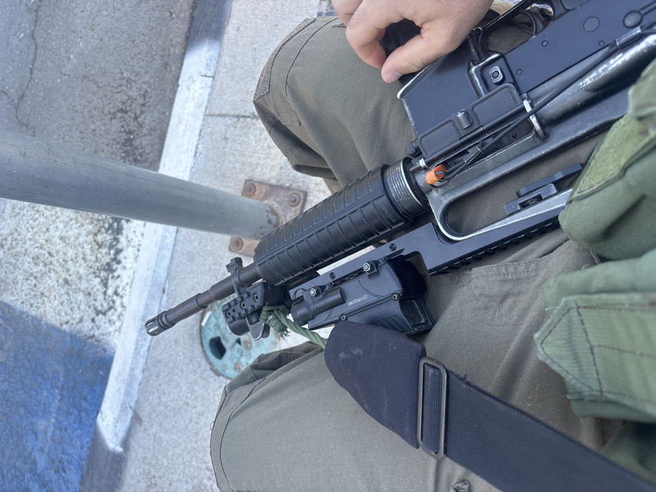 A close-up, overhead view depicts the lower body of an individual, clad in olive green tactical pants, seated outdoors in the Brener Regional Council, Israel. A rifle, consistent with an M4/AR-15 platform, rests horizontally across the lap. The rifle is equipped with a black heat shield on the handguard, a birdcage flash hider, and a black tactical accessory (likely a light or laser) mounted on the front. A green paracord is tied near the front sight post. The rifle's charging handle displays an orange safety tag. A black tactical sling is visible across the person's left thigh, and a portion of a green tactical pouch is seen on the lower left. The individual's right hand rests on the rifle's upper receiver, near the bolt carrier group. The ground consists of concrete or asphalt, alongside a grey metal pole anchored by four bolts, and a curb painted blue and white. A circular metal utility cover is partially visible on the ground.