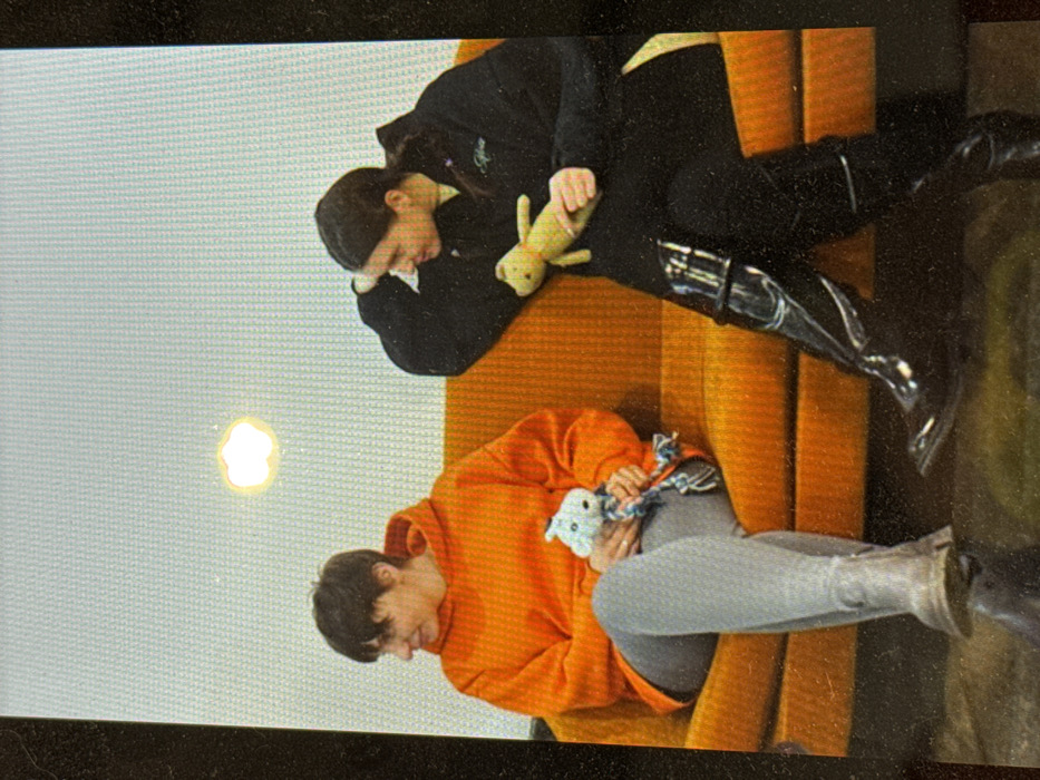 The image depicts two female individuals seated on an orange, ribbed upholstered sofa against a plain, light-colored wall, illuminated by a single cloud-shaped light fixture