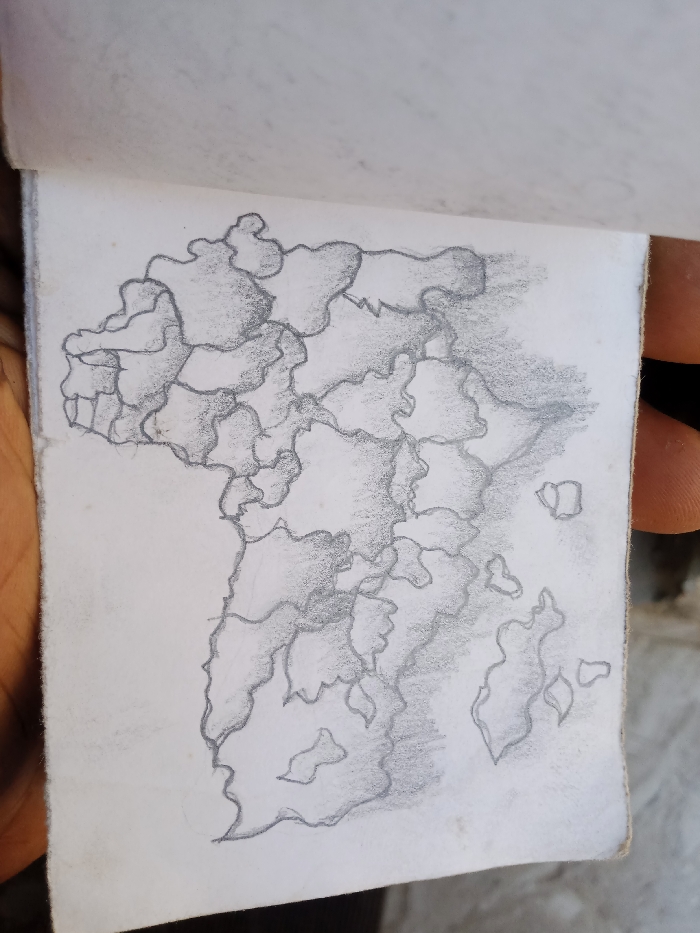 A dark-skinned human hand holds a single sheet of off-white paper vertically, centered in the frame. The paper displays a detailed pencil drawing of the African continent, with internal lines demarcating its various countries and surrounding islands. Sections of the drawing are shaded with gray pencil. The top edge of the paper is slightly curled upwards, suggesting it is part of a larger pad or notebook. The hand grips the paper from the right side, with a thumb and forefinger visible, and a portion of another finger supports the left edge. The background is indistinct and out of focus. This scene is located in Akwanga, Nigeria.