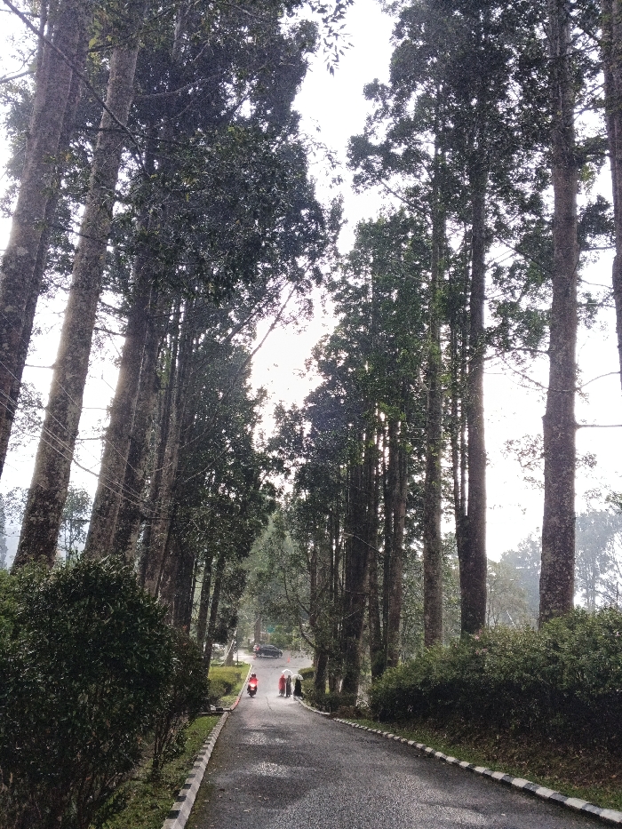 A long, wet, paved road stretches into the distance, flanked by towering trees reaching high into a bright, overcast sky. Lush green bushes line the road's edges. In the distance, figures with an umbrella walk along the road, accompanied by a person on a scooter. The scene conveys a sense of serenity and dampness within a forest-like setting.