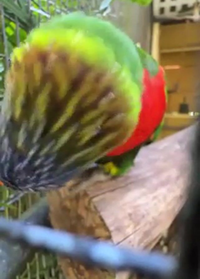 colorful parrot sitting on a wooden perch inside a cage. The bird has green, yellow, gray, and red plumage, with an orange beak and a red eye. It looks directly at the camera, tilting its head inquisitively, and then pecks at the camera lens. The background shows foliage and part of the cage structure.
