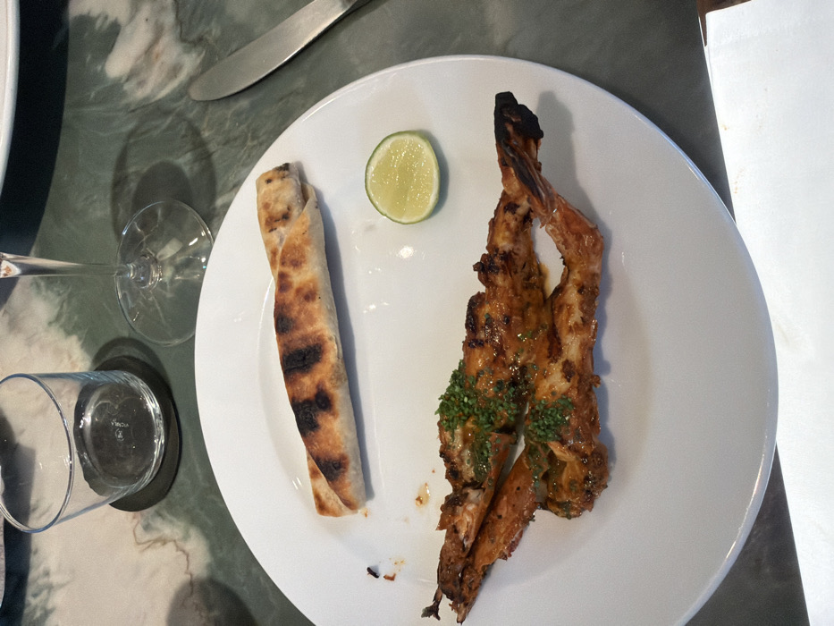 A white plate displays a culinary presentation. There's a grilled wrap, a slice of lime, and grilled shrimp garnished with green herbs. Nearby, a water glass sits on a coaster, while a wine glass and knife are partially visible on a marbled surface.