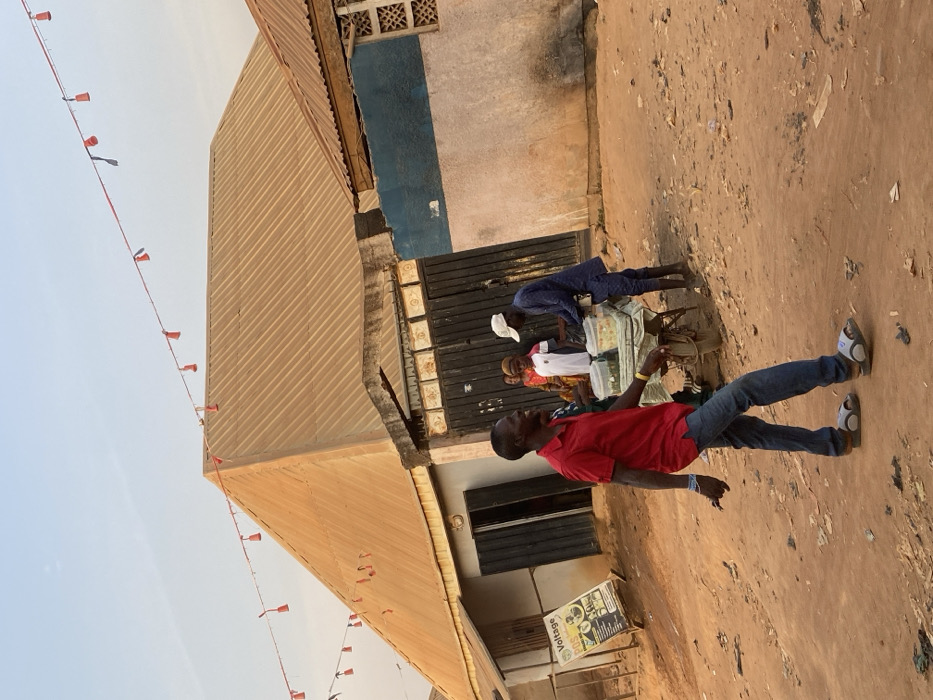 A street scene shows a man in a red shirt and jeans standing in the dirt. He's facing away from a food cart where two other individuals are present. A fourth person, also dressed in blue, leans over the cart. Behind them is a building with a corrugated metal roof and a blue and white wall. Red flags are strung along the side of the roof. A poster advertising "Voltage 20" is visible near the bottom of the frame.