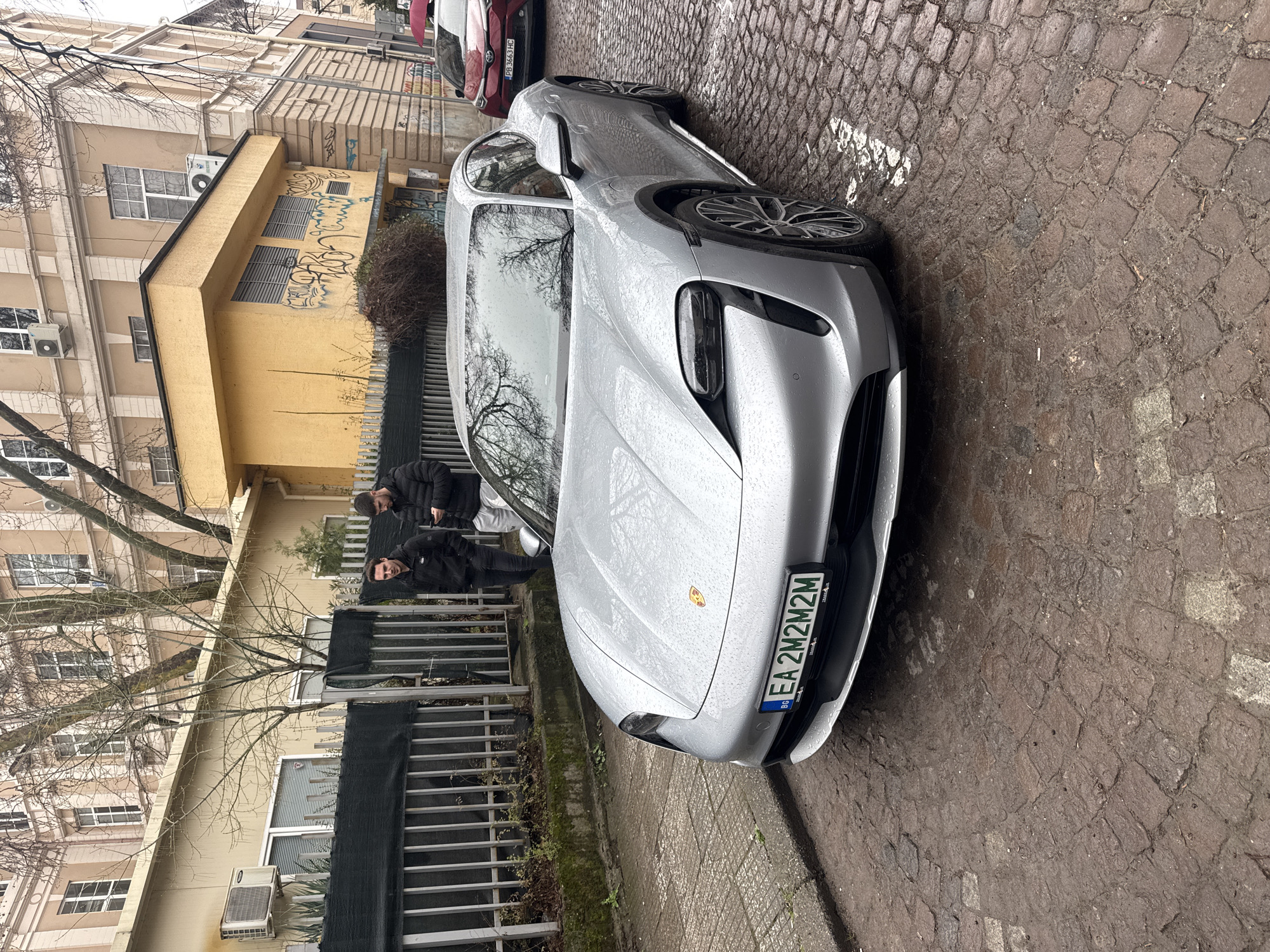 A silver Porsche Taycan Cross Turismo, bearing Bulgarian license plate BG EA 2M2M2M, is parked on a wet, cobblestone street in the city of Plovdiv, Bulgaria. The vehicle's exterior is covered in numerous small raindrops. Behind and to the left of the Porsche, two adult males are standing near a dark metal fence. The male on the right is observed looking down at a smartphone. The background consists of several buildings: to the immediate left, a single-story, light-yellow structure with multiple windows and an externally mounted air conditioning unit. Behind this structure, a taller, multi-story beige building with numerous white-framed windows and architectural elements, including cornices, is visible. A smaller, single-story yellow building with slatted windows and graffiti on its wall abuts the larger beige building. Bare tree branches are visible against the backdrop of the buildings. Further down the wet, cobblestone street, behind the Porsche, a red Toyota C-HR with Bulgarian license plate PB 3663 HC is parked. The street surface is composed of dark, wet, irregularly shaped cobblestones. A narrow, wet concrete sidewalk is present along the left edge of the street.