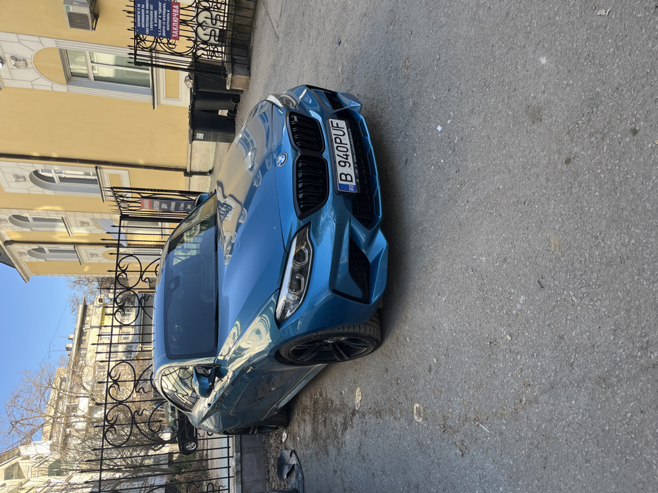 A metallic teal blue BMW M2 coupe, bearing Romanian license plate B 940PUF, is parked on an asphalt surface