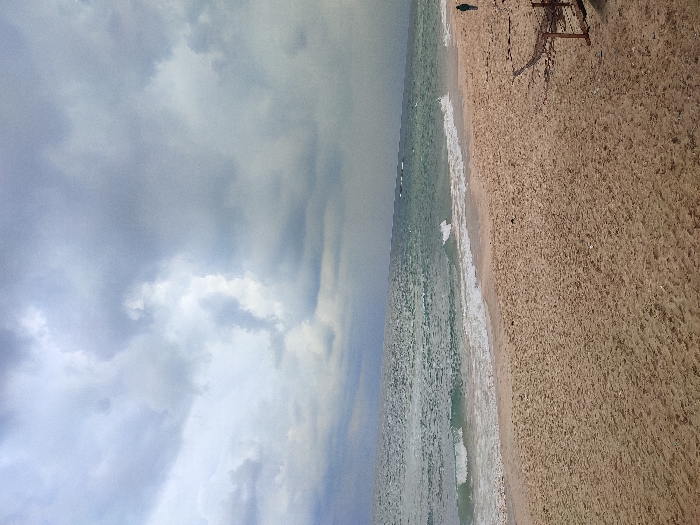 The image depicts a wide, sandy beach in Al-Mawasi, Unknown, under an overcast sky dominated by heavy, dark grey clouds with lighter patches