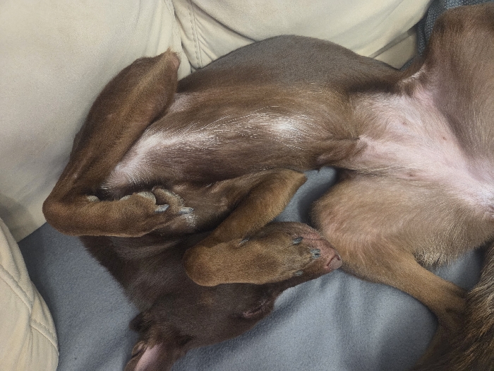 An indoor scene in Vrabevo, Bulgaria, depicts a single brown dog. The canine is positioned on its back, curled into a compact posture on a light blue-grey blanket. Its underside, exhibiting sparse, lighter brown fur over pinkish skin with small dark spots, is fully exposed. The dorsal side and limbs are covered in denser, darker brown fur, interspersed with fine white hairs. The dog's forepaws are bent towards its chest, revealing dark claws. Its head is partially visible at the bottom of the frame, tucked in, with a portion of its snout and ear discernible. A segment of light-colored, upholstered furniture is visible along the left and top edges of the image. The dog is in a state of repose, with no active interactions observed.
