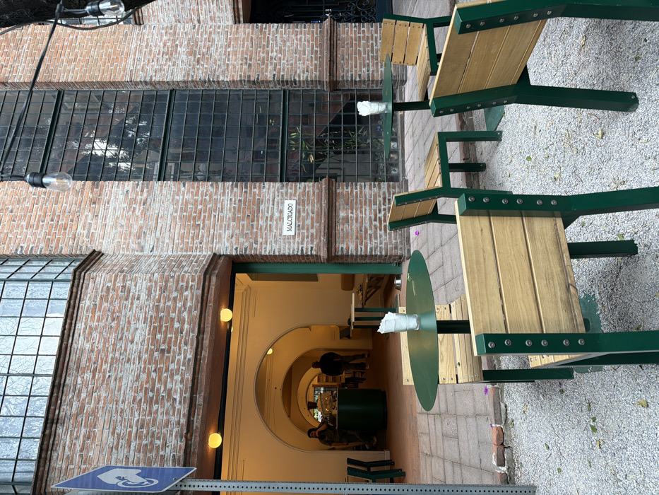 A brick building with large windows sits adjacent to an outdoor seating area. Unique tables feature wooden tops with green metal frames and round, green metal centerpieces. A small sign reading "MALCRIADO" is visible on the brick wall. An arched entryway provides access to the interior, where people and furniture are discernible. A street sign with a wheelchair symbol is in the foreground.
