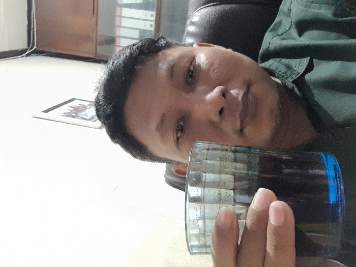 A man lounges in a dark leather chair, holding a patterned glass with a blue rim. He wears a dark green shirt. The background includes a white wall and a wooden cabinet with files. A framed picture rests on the floor. The man gazes at the camera, his face angled in the frame.