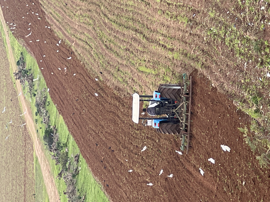 An elevated view captures an agricultural field in Salé, Morocco, where a single individual operates a blue and grey tractor with a white canopy. The tractor is actively engaged in tilling the reddish-brown earth using a rear-mounted implement, creating distinct furrows. To the right, a section of the field exhibits established green crops arranged in parallel rows. Numerous white birds, identified as likely egrets, are distributed across both the freshly tilled soil and the untrilled sections, with several appearing to follow the tractor. Scattered dark birds are also visible within the field. In the upper left background, a dirt road runs parallel to the field, bordered by green scrubland and sparse vegetation. The scene is illuminated under diffused light.