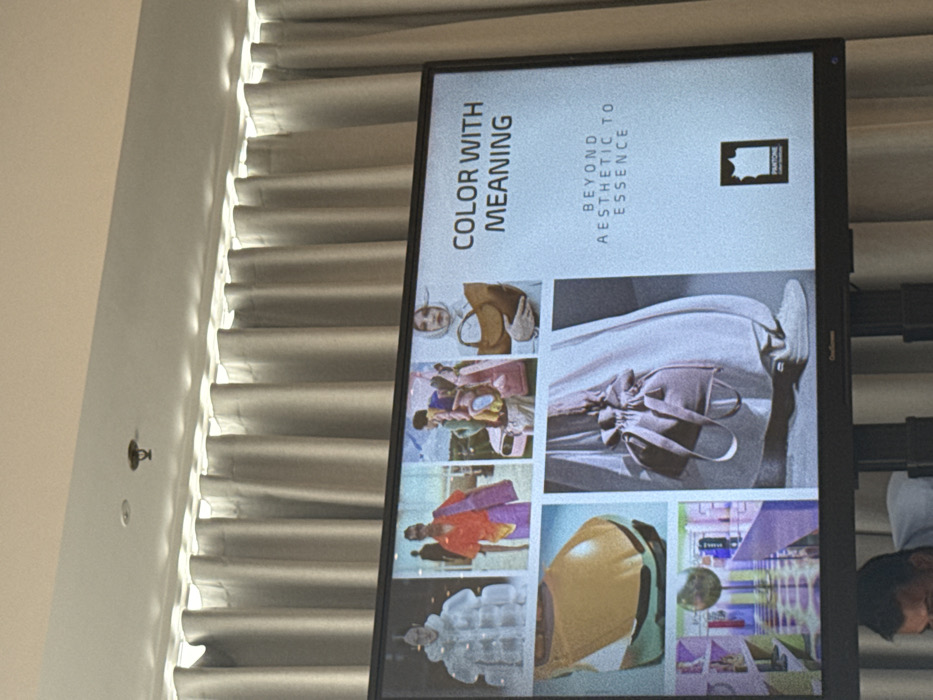 An indoor scene in a modern room, likely a conference or event space in Business Bay, United Arab Emirates, is dominated by a large, active flat-screen display mounted on a stand. The display presents a presentation titled "COLOR WITH MEANING" with the subtitle "BEYOND AESTHETIC TO ESSENCE" and features the Pantone Color Institute logo in the bottom right corner. The left side of the screen shows a grid of six distinct images: a person in a transparent, segmented inflatable garment; a person in an orange shirt and purple pants carrying a large pink tote bag outdoors; a person surrounded by multiple pastel-colored bags near a light-colored vehicle; a person wearing a headscarf (hijab) holding a brown crescent-shaped handbag; an abstract, multi-toned object in gold, orange, and mint green; and a close-up of a person's lower body wearing light clothing and white sneakers, holding a dusty rose drawstring bag. Below these, a small portion of a seventh image depicts a room with purple and pink elements, a reflective sphere, and checkered flooring. The environment includes a floor-to-ceiling wall of light-colored, pleated curtains behind the display. The white ceiling features multiple recessed lights and a visible fire sprinkler head. Partially visible at the bottom center of the frame is the head and shoulder of an individual wearing a light-colored shirt, positioned in front of the display. The brand "OneScreen" is faintly visible at the bottom bezel of the monitor.