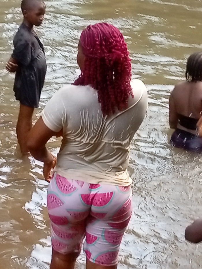 The scene depicts three individuals partially submerged in shallow, murky brown water within Igbenu, Nigeria. In the immediate foreground, an adult female is observed from behind, standing in the water. She has elaborate dark red, curly hair and wears a wet, light-colored t-shirt over light-colored shorts patterned with pink and green watermelon slices. Her left arm is bent at the elbow. To her left, a child stands partially submerged, facing slightly away from the viewer and towards the foreground female, wearing a dark, wet shirt with hands appearing clasped behind their back. Further in the background to the right, a third individual is partially visible, appearing to be seated or crouching in the water, dressed in dark swimwear. The water surface displays ripples, indicating movement.