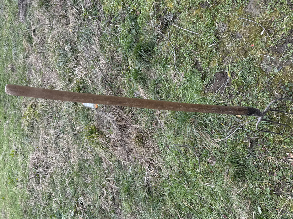 - "A weathered pitchfork with a long, light brown wooden handle and four dark metal tines is vertically embedded in the ground at an unspecified outdoor location within the city of Radomirtsi, Bulgaria" by FM-IbUYE3, licensed under CC BY 4.0