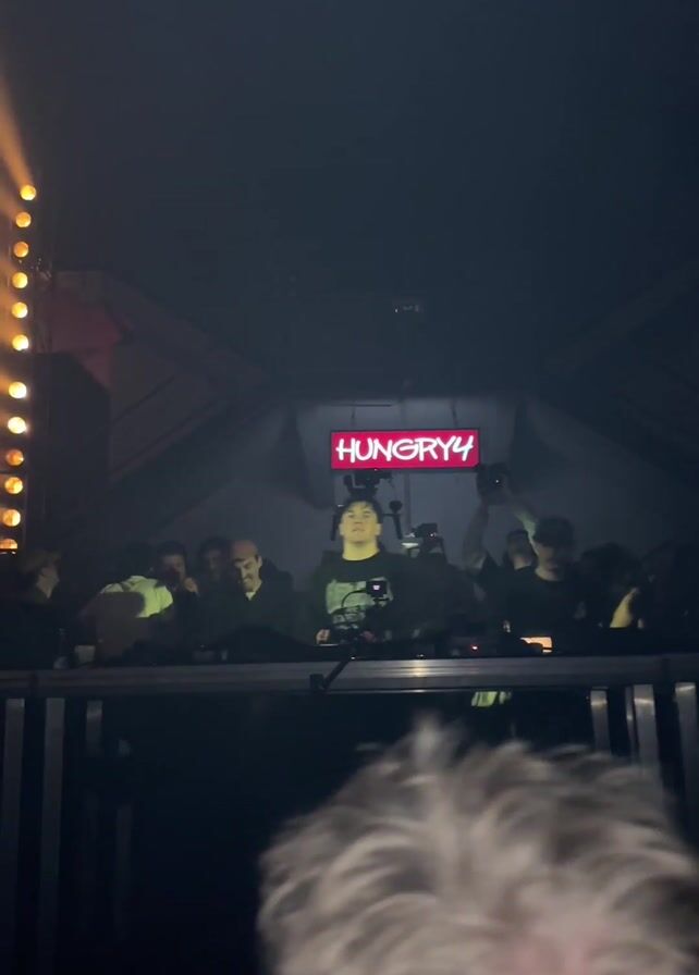 DJ performing at a crowded event with the stage name “HUNGRY4” displayed in a red light sign. The DJ is standing behind a mixing console with other people around. The scene is dark and smoky, with several beams of light illuminating the space. Some people are taking photos. The camera angle is from behind a person with short, light-colored hair.