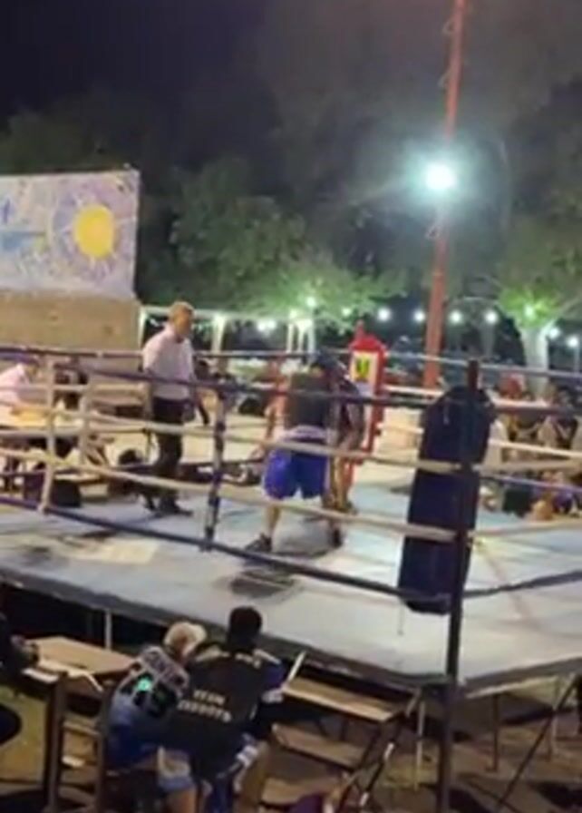 The video captures a boxing match taking place at night. Two boxers, one in blue shorts and the other in grey shorts, are actively fighting in a boxing ring. The referee, dressed in a white shirt and dark pants, closely watches the fight, occasionally stepping in. Around the ring, spectators are visible, seated and standing, observing the match. A few people are sitting at a table adjacent to the ring. Trees and buildings are visible in the background, illuminated by streetlights. A large painting or mural depicting a sun is also present in the scene.