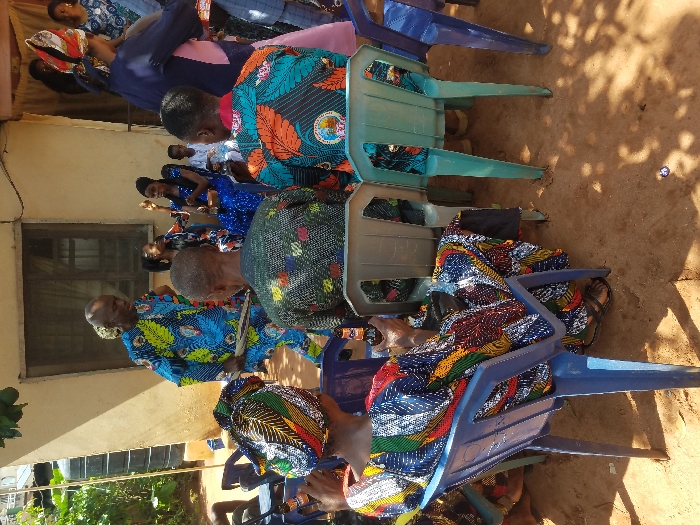 The image depicts an outdoor social gathering in a dry, unpaved yard adjacent to a single-story, light-colored building in Unknown, Unknown. Approximately ten to twelve individuals, predominantly adults, are present under bright daylight. In the foreground, three individuals are seated with their backs to the viewer on blue, gray, and light green plastic chairs. The leftmost individual, wearing a colorful patterned headwrap and dress, holds a brown bottle in her right hand. The central individual wears a dark green patterned shirt, and the rightmost individual wears an orange and teal patterned shirt. In the midground, a bald man in a vibrant blue and green patterned traditional outfit stands, holding a hand fan, and is oriented towards a group of seated individuals in the background. This group includes multiple women, some wearing blue patterned dresses, and at least one child. A woman in a dark blue top and multi-colored headwrap is partially visible standing on the far right midground. A black cylindrical water tank is visible in the upper left background, adjacent to the building. The ground is unpaved, reddish-brown dirt, with strong shadows indicating bright overhead sunlight. Vegetation is visible in the upper left and right corners of the frame.