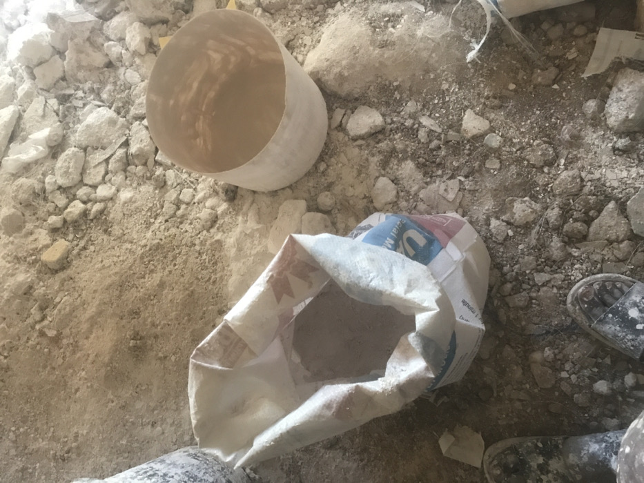 The image depicts a ground-level view within a dusty, gravelly environment consistent with a construction or material preparation area in Gwong, Nigeria. A partially open white woven polypropylene sack, featuring blue and red markings including "U-mix" or similar branding and text such as "Special Mortar" and "Mix for 1 minute," contains a light grey powdery substance. To the right of the sack, an empty, light-colored cylindrical container rests upright on the disturbed ground. In the lower-left corner, the feet of an individual, wearing dark, dust-covered slide sandals, are partially visible.