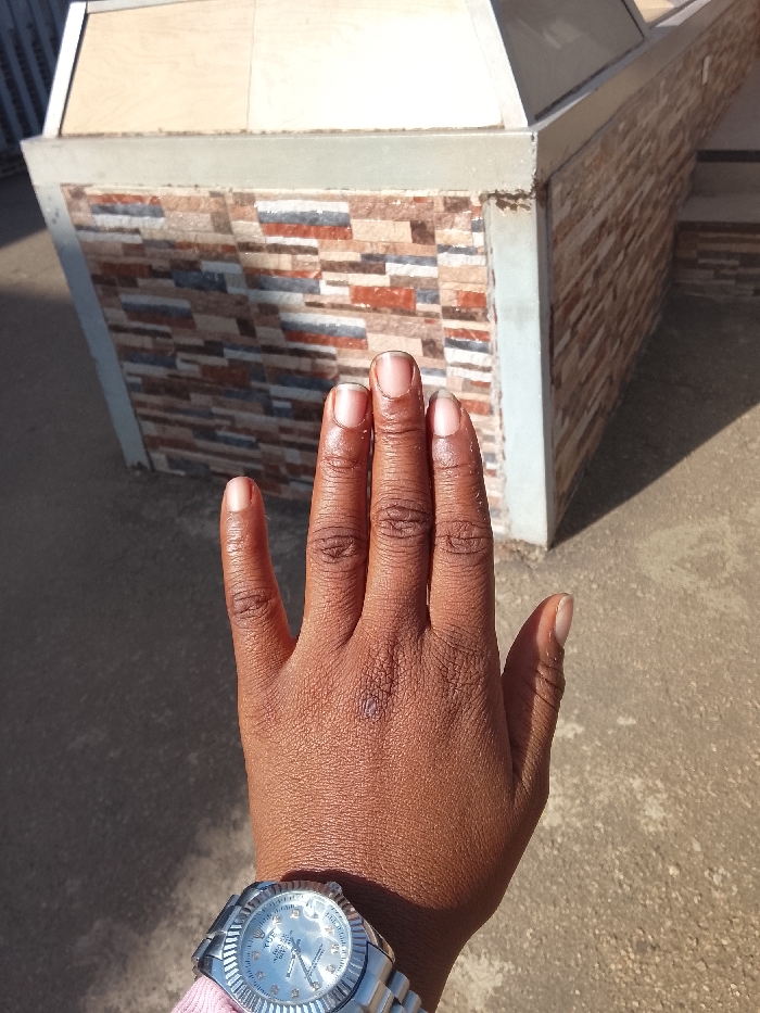 A dark-skinned hand is prominently displayed, wearing a silver wristwatch with a white face and a detailed band. The nails are unpolished and short. The hand is positioned in front of a decorative, low-rise structure made of stone tiles in varying shades of brown, tan, and gray. The background features a concrete or paved surface, partially shadowed, suggesting an outdoor setting under bright sunlight.