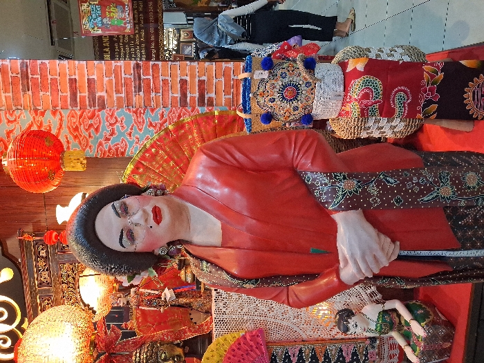 The image displays an indoor commercial display in Yogyakarta, Indonesia, featuring a central female mannequin adorned with a blend of Javanese and Chinese cultural elements