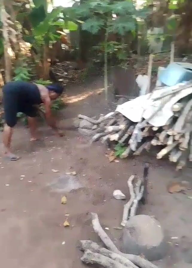 woman using a hoe on dirt in a rural outdoor setting. Behind her are several banana trees and other foliage. To the right is a pile of firewood with a white tarp partially covering more wood. The camera moves from the woman to the covered wood and then pans to another woman who is using a sieve over a bowl, possibly filtering some kind of liquid.